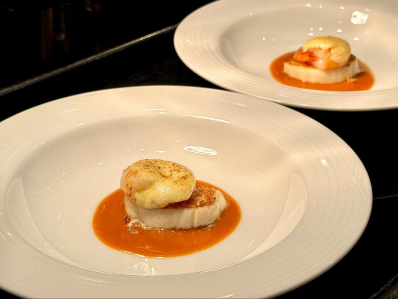 ▲海老の鉄板焼き 魚介と豆腐のムース ~アメリカンソース~
