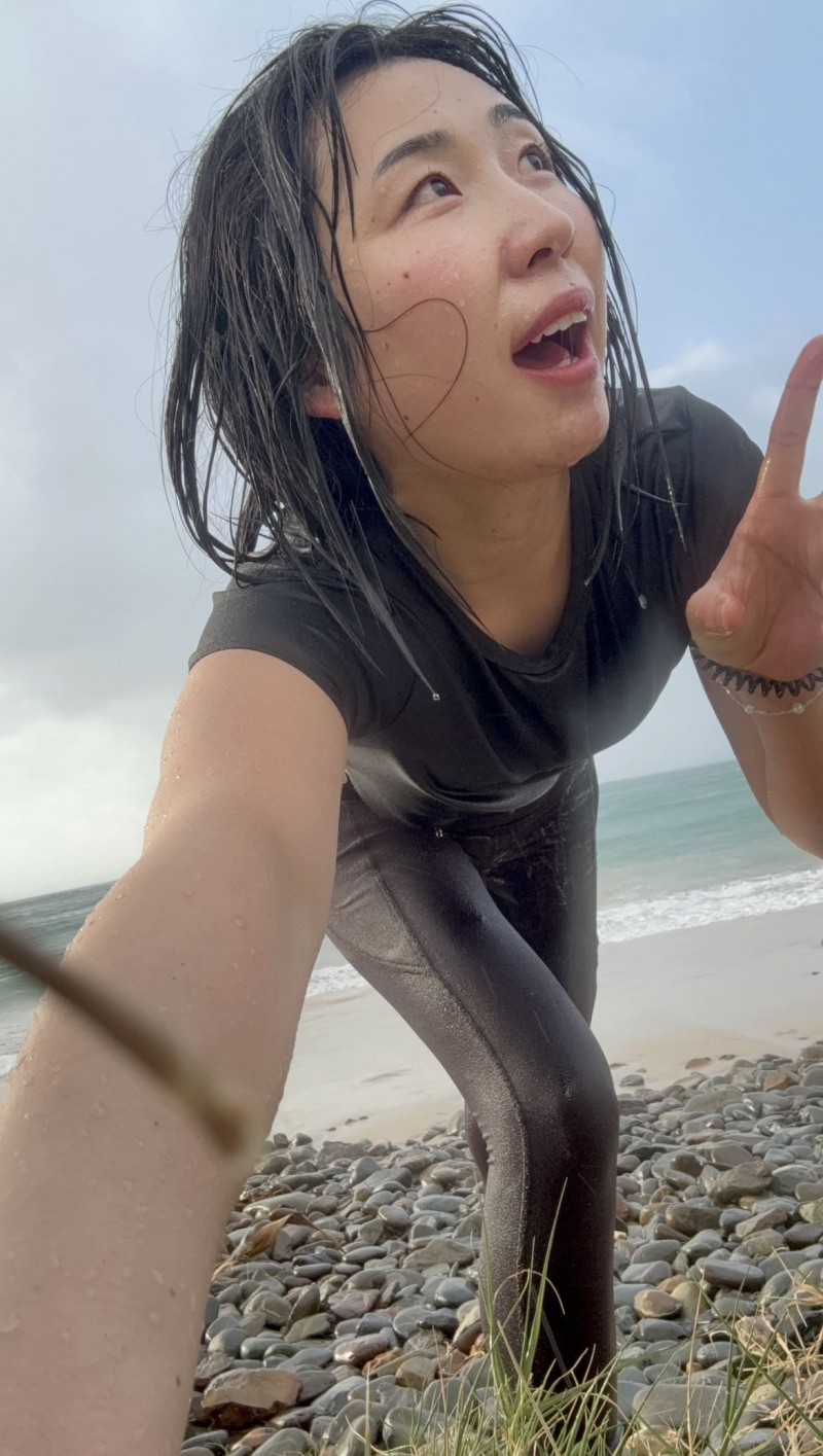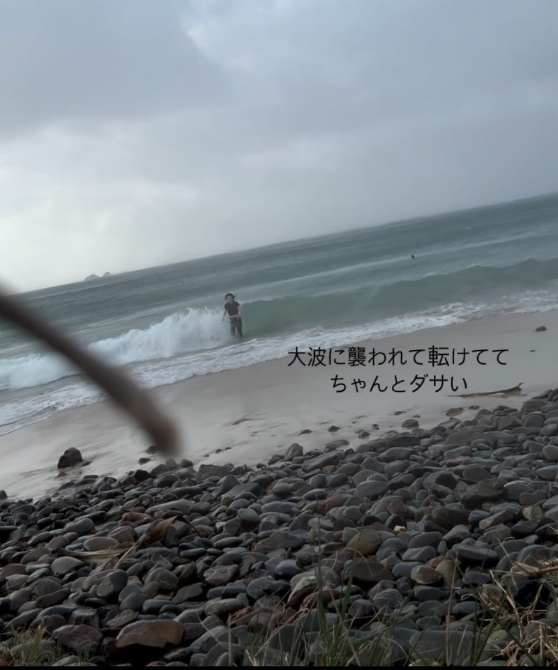 ところが、頭の高さほどの波にいきなり飲まれ、息ができず一瞬本気で焦りました…。自然のパワーを痛感しつつ、雨と波に包まれながらプカプカ浮かぶひとときは、ある意味忘れられない体験。