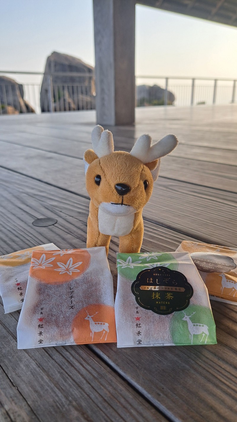 山頂まで来た清々しい気持ちと、絶景を臨む中、登山前に商店街の〚紅葉堂〛で購入したもみじまんじゅうをいただきました。