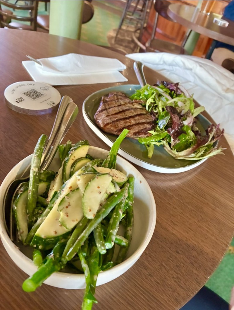 この日はすでにお腹も満たされていたので、小さめのステーキとズッキーニとインゲン豆の茹で野菜を2人でシェア。