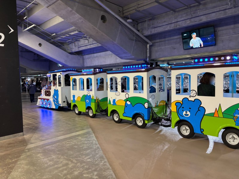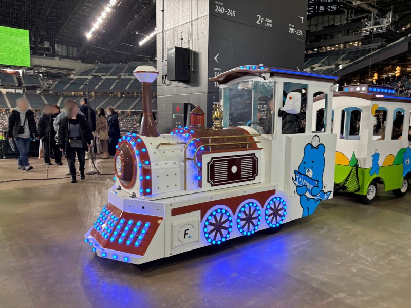 家族連れに人気なのが、球場内を走る「えふたんトレイン」。この存在感で、音楽を流しながら1階のコンコースを周回しているため、歩いているとひときわ目を引きます。