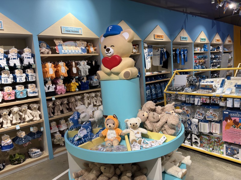 キッズ用のユニフォームやキャップ、えふたんや球団マスコットたちのかぶりものも充実。自分でわたを詰めて、オリジナルのテディベアを作ることもできます。