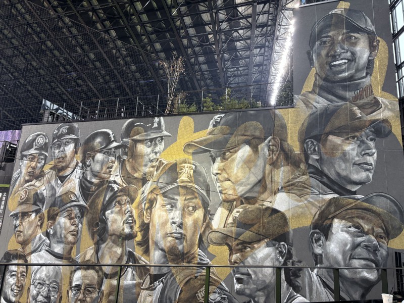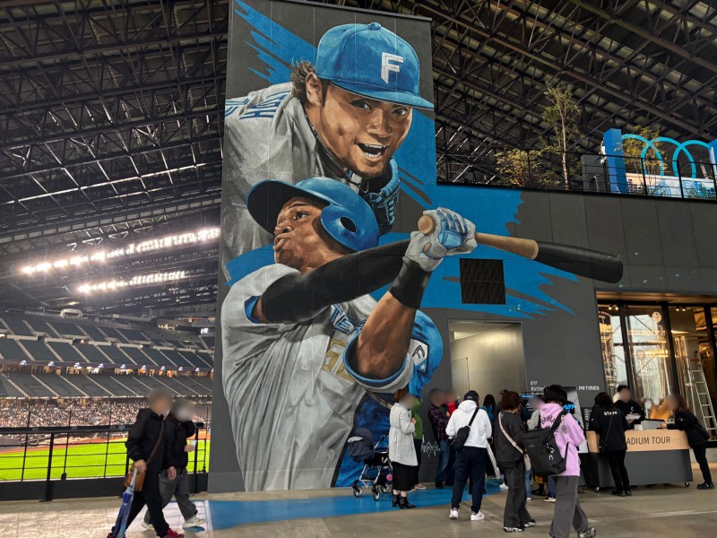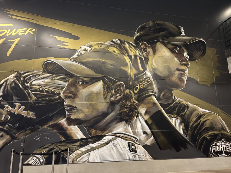 エスコンを訪れたら見てほしいのが、ファイターズが誇るOB、ダルビッシュ有選手と大谷翔平選手を描いた巨大な壁画。